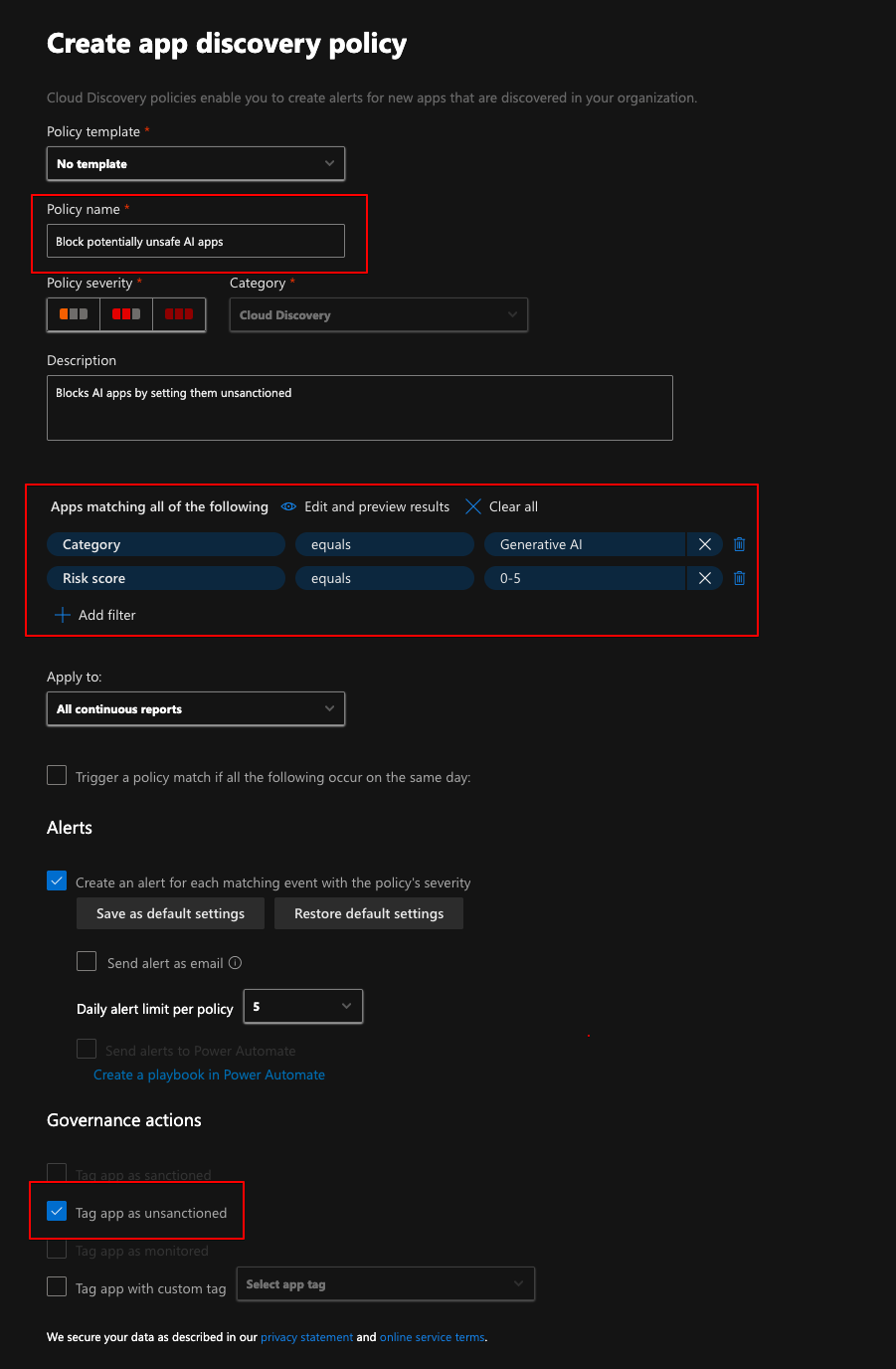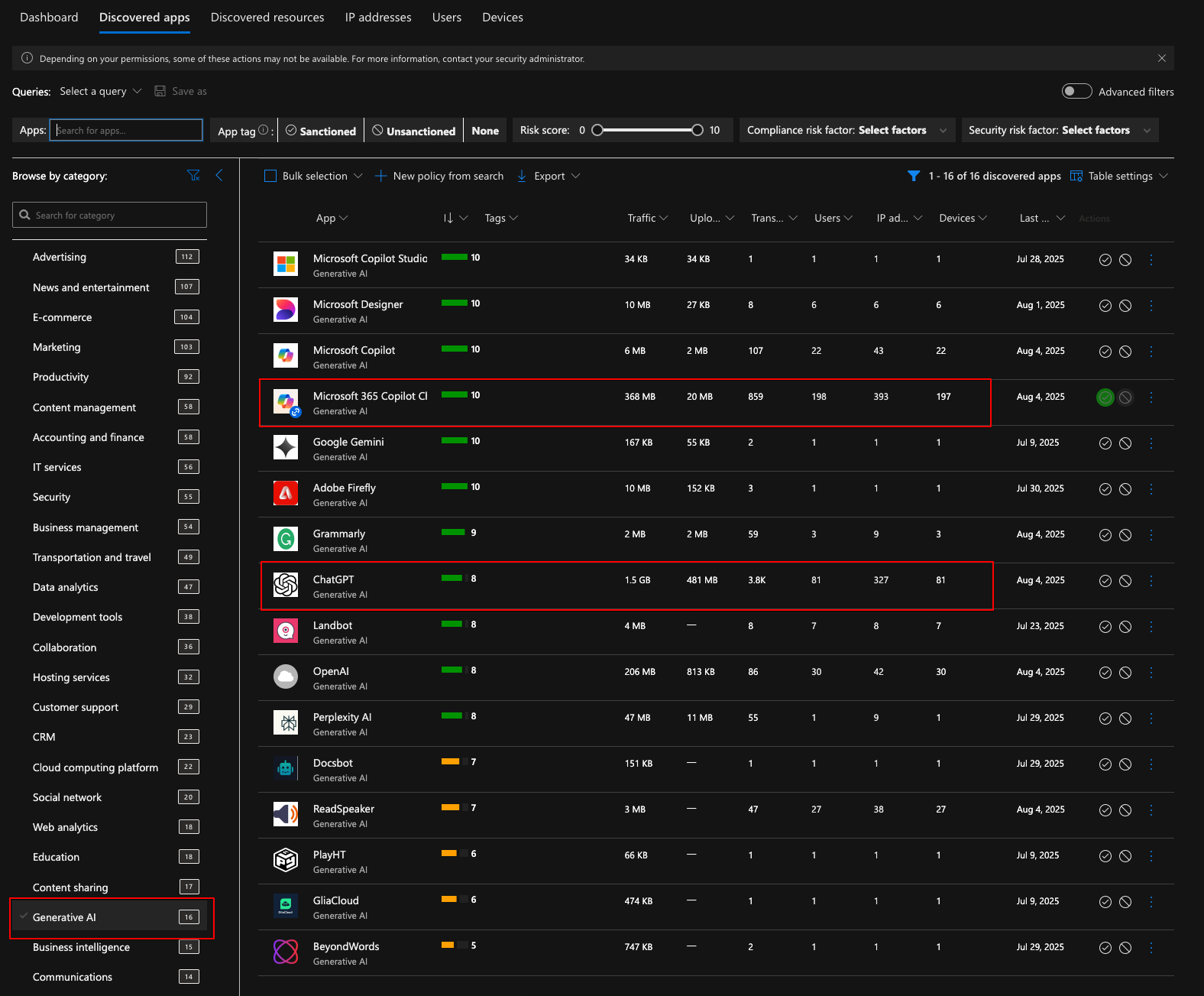 This data can be used to base policies on. For example, I would not like to allow any generative AI apps with a risk score below 6, so I could create an app discovery policy and tag those apps as unsanctioned.