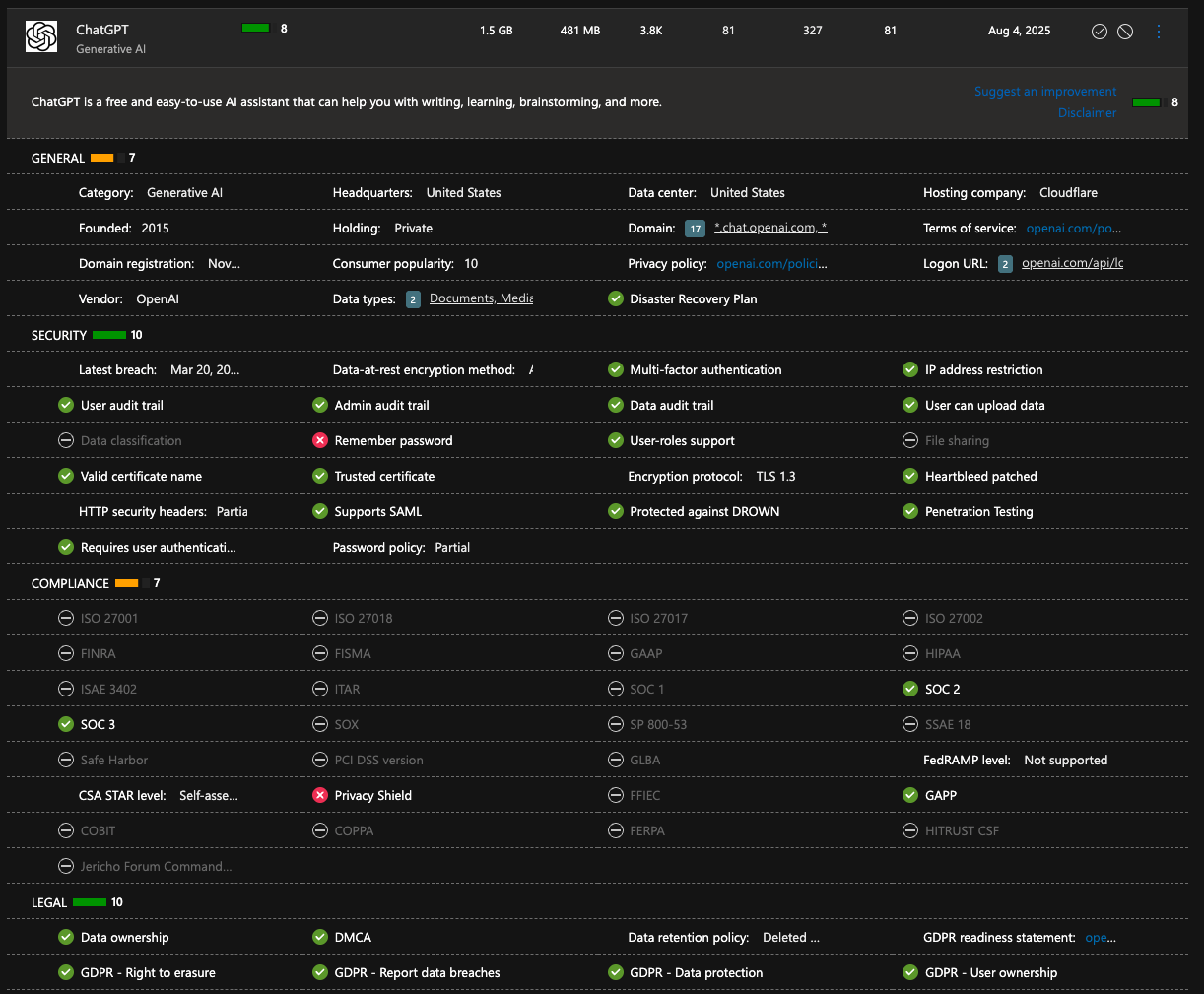 Once enabled, the Cloud App Catalog shows you all discovered apps with a risk score. Below is a breakdown of ChatGPT — it has a risk number of 8 because it did not pass checks for remember password and Privacy Shield: