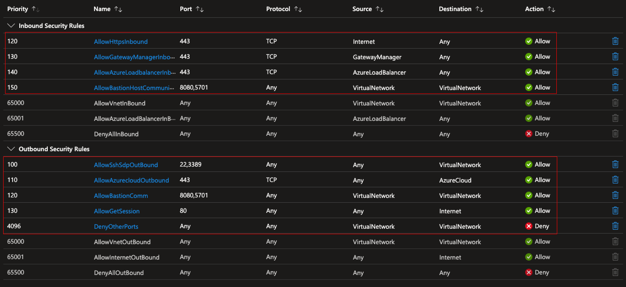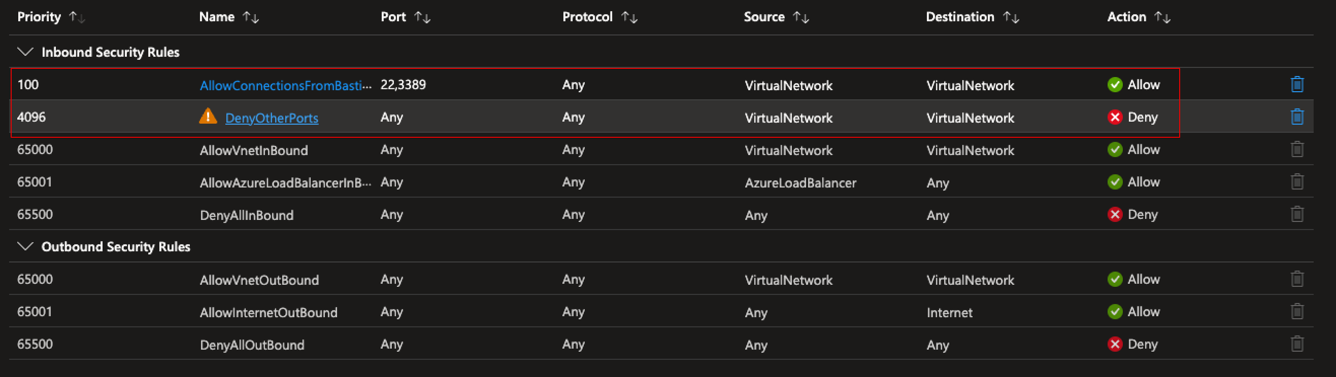 - Allow outbound from Bastion to VMs on ports 3389 (RDP) and 22 (SSH)