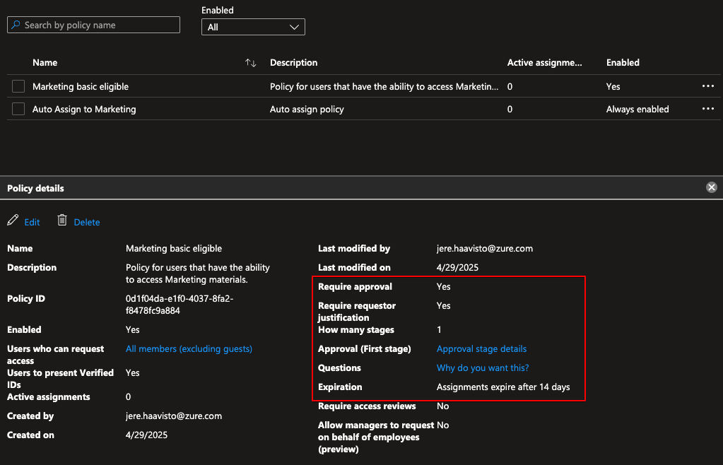 Here I made a policy that requires one approver, the requester must provide justification, and after approval the access expires in 14 days: